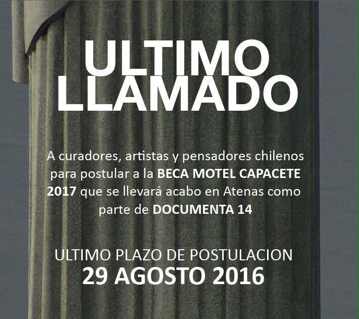 Beca Motel La Beca Motel tiene por objetivo llevar anualmente a un artista chileno, menor de 40 años, a la residencia de Capacete, y este año a Grecia en el marco de Documenta 14. La Beca cubrirá sus gastos de manutención, de producción de obra y las actividades derivadas de la residencia. La selección de los artistas será hecha por el equipo de Capacete. Esta residencia le permitirá a los artistas ampliar sus prácticas artísticas y/o curatoriales, como asimismo, su red de contactos con actores e instituciones de la escena internacional.
